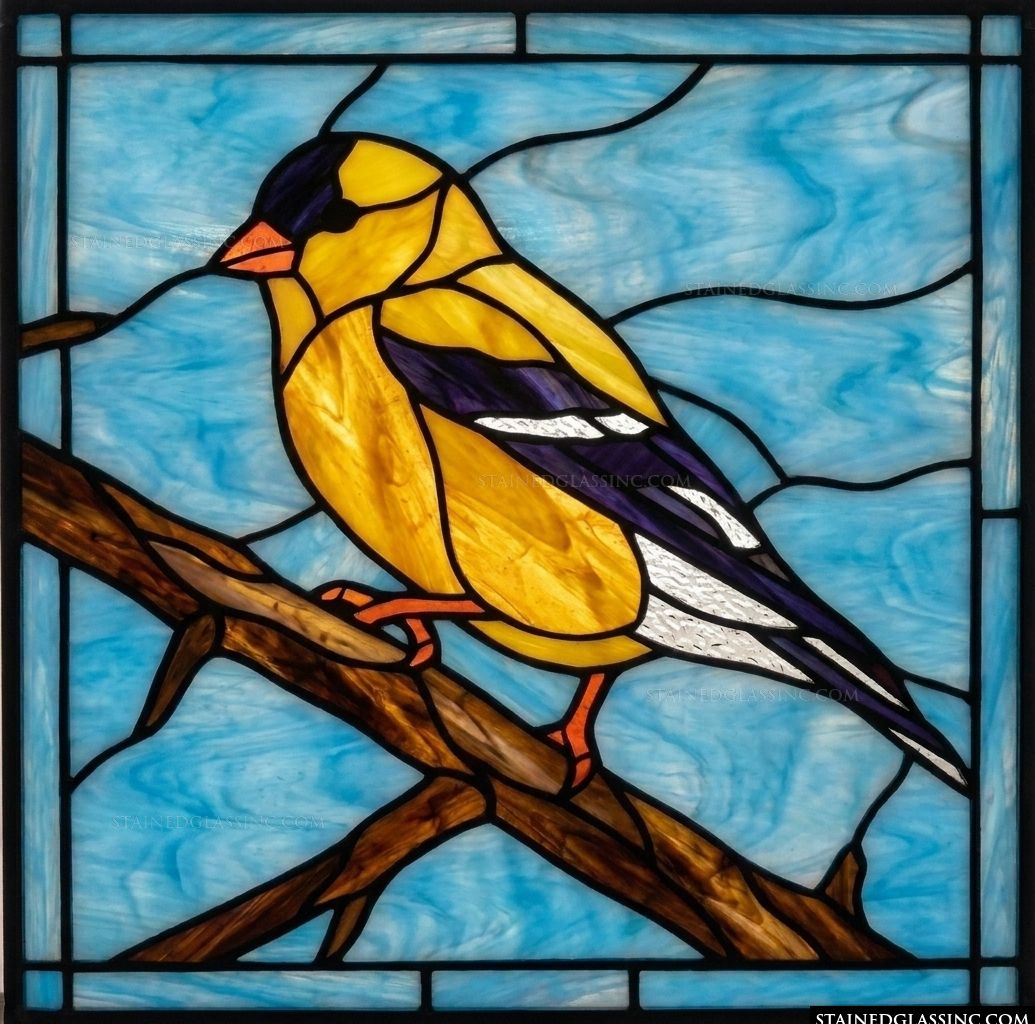 Bring the cheerful spirit of the garden indoors with this stunning stained-glass-style depiction of an American Goldfinch. The bird's iconic, radiant yellow plumage glows with warmth, beautifully contrasted by its bold black and white wings and the intricate, earthy tones of the rustic branch upon which it rests.