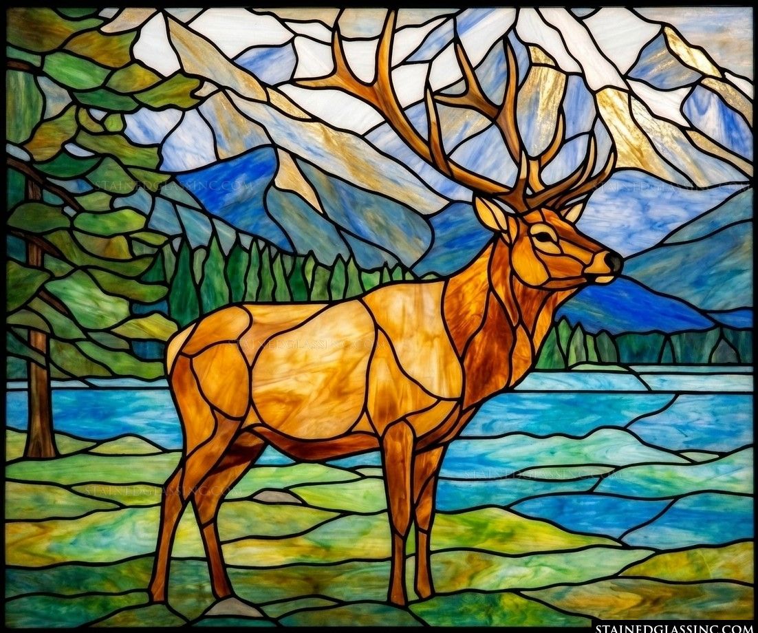 Behind the elk, towering mountains rise into the sky, their peaks dusted with snow and reflecting a tranquil blue. Below, a calm, crystalline lake stretches across the landscape, complemented by the lush green hues of the nearby forest. This artwork serves as a beautiful tribute to the majesty of wild animals and the peaceful serenity of the mountain landscape.