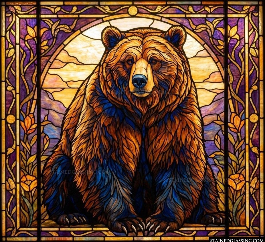 Embrace the rugged beauty of the wilderness with this striking portrait of a grizzly bear. Rendered with intricate detail, the bear sits in a dignified, quiet posture, its thick coat depicted in rich, textured shades of amber, bronze, and deep indigo that seem to glow with a life of their own.