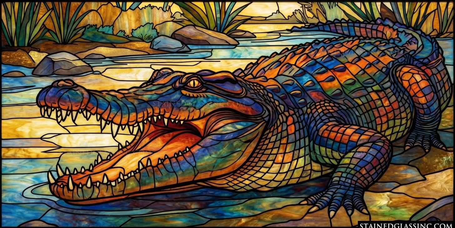 Bring the untamed beauty of the wetlands into your home with this stunning, luminous design. A powerful alligator rests calmly at the water's edge, its textured scales captured in an array of glowing, kaleidoscopic colors that dance with the changing light.