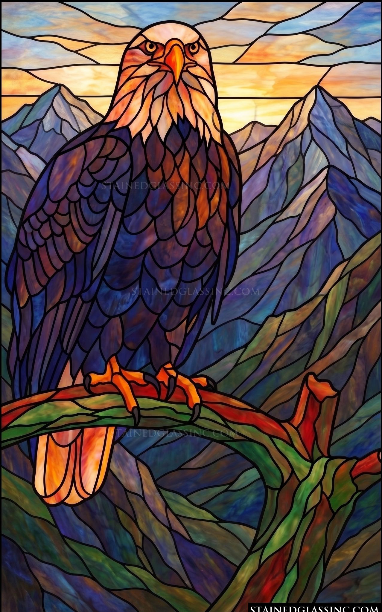 Embrace the power and freedom of the American landscape with this stunning piece of art. A magnificent bald eagle sits stoically upon a gnarled branch, its keen gaze fixed forward, commanding respect and admiration. The intricate details of the raptor's plumage are brought to life through a rich palette of deep blues, fiery oranges, and warm ambers, creating a sense of depth and vibrant movement.