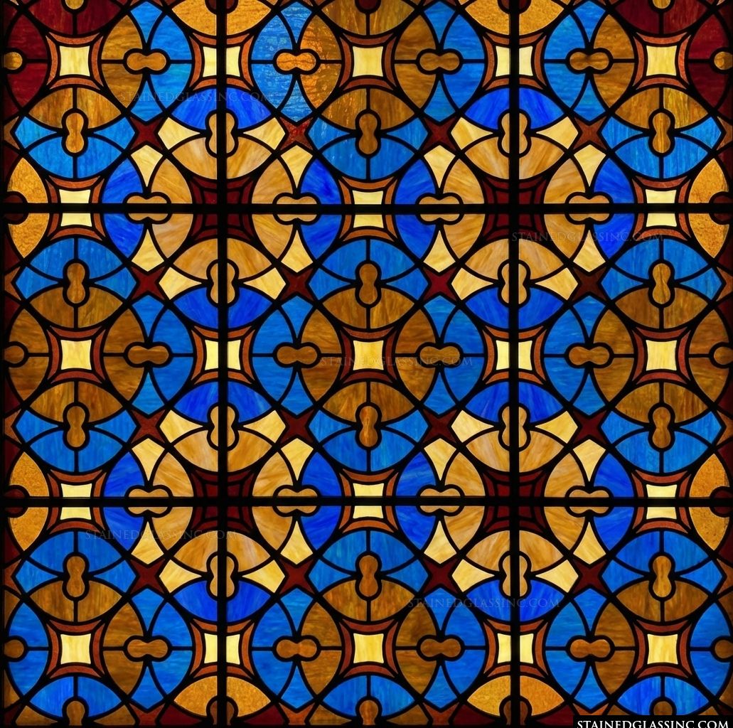 This captivating stained-glass-style design features a sophisticated geometric lattice, meticulously composed to create a sense of harmony and order. The interplay of vibrant cobalt blue and glowing amber creates a warm, inviting atmosphere, casting beautifully colored light across your room.