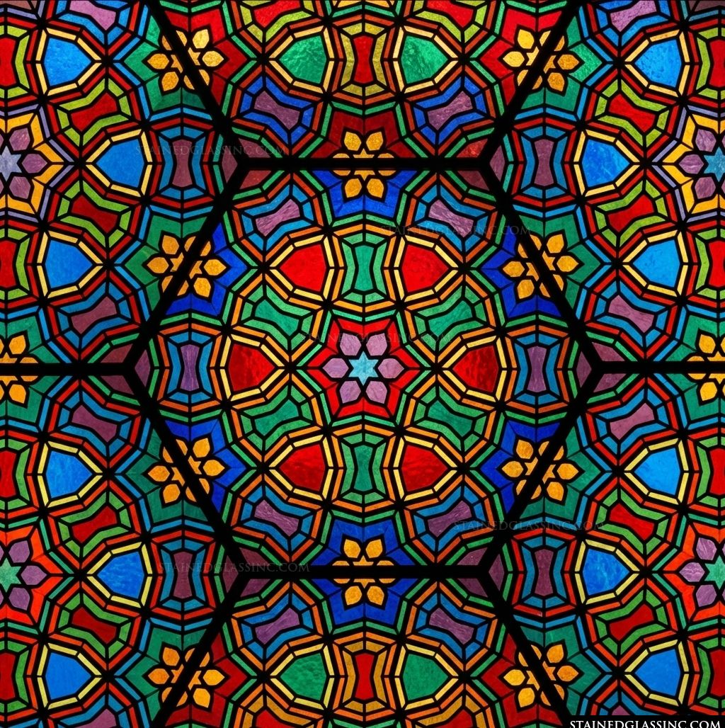 Experience the hypnotic beauty of this intricate, stained-glass-style design. Featuring a repeating hexagonal structure, the artwork draws the eye toward the center, where vibrant colors converge in a perfect, star-like symmetry. Each geometric cell is filled with a rich palette of deep blues, fiery reds, emerald greens, and warm ambers, creating a kaleidoscopic effect that dances with light.