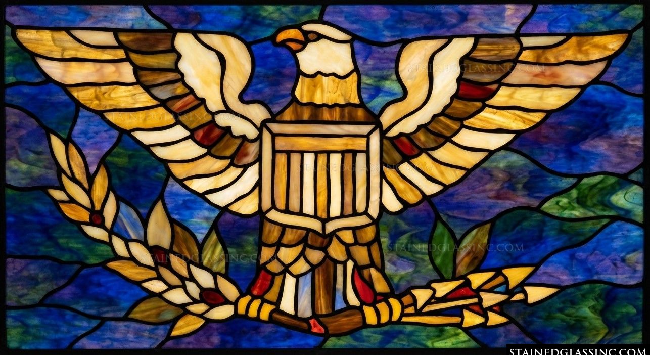 Celebrate the timeless symbol of strength and freedom with this stunning, stained-glass-style artistry. The central figure of a soaring American eagle is rendered with meticulous detail, its expansive wings and focused gaze creating a powerful, commanding presence. The iconic shield and bundle of arrows are expertly integrated, lending a sense of history and noble purpose to the composition.