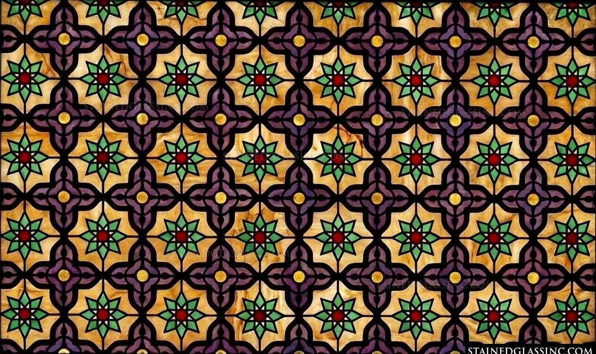 This stunning design showcases the precision and beauty of classic geometric artistry. A recurring motif of eight-pointed stars, rendered in brilliant emerald green with deep red centers, dances across an amber-toned field. The stars are nestled within graceful, deep purple quatrefoil shapes, creating a rhythmic, hypnotic visual experience.