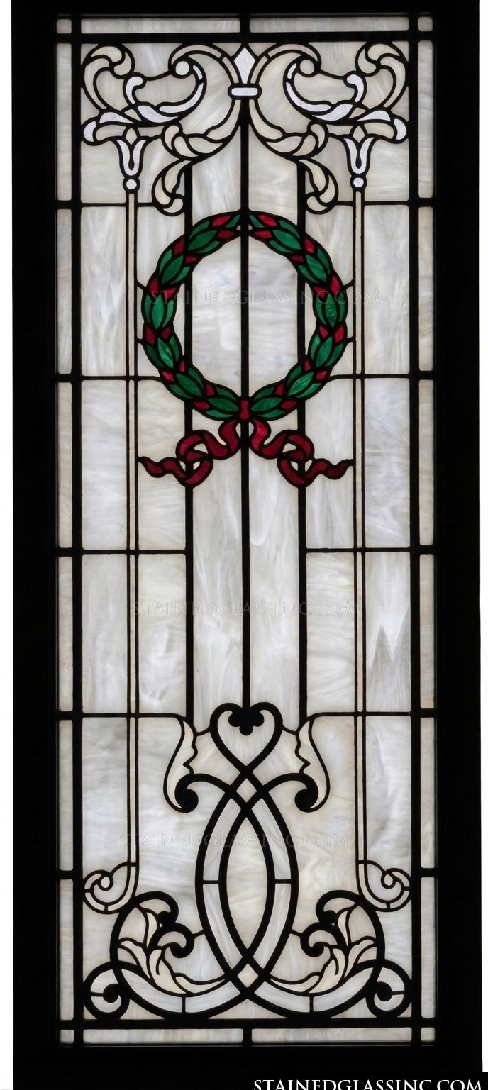 This refined stained-glass-style design captures the timeless symbolism of the laurel wreath. The lush green foliage is expertly accented by a bold, flowing red ribbon, creating a striking contrast that draws the eye. The intricate composition is finished with sweeping, elegant scrollwork at the base, lending an air of sophisticated tradition to the piece.