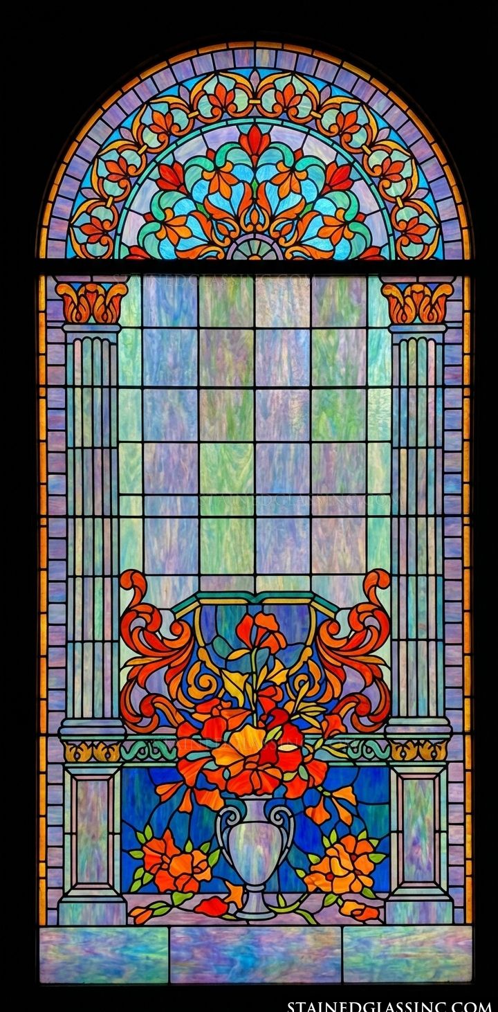 The composition is framed by stately architectural pillars that draw the eye upward toward an intricate, fan-like arched medallion. This masterfully balanced piece brings a sense of light, color, and sophisticated artistry to any space, offering a timeless aesthetic that celebrates the beauty of nature within a refined, structured form.