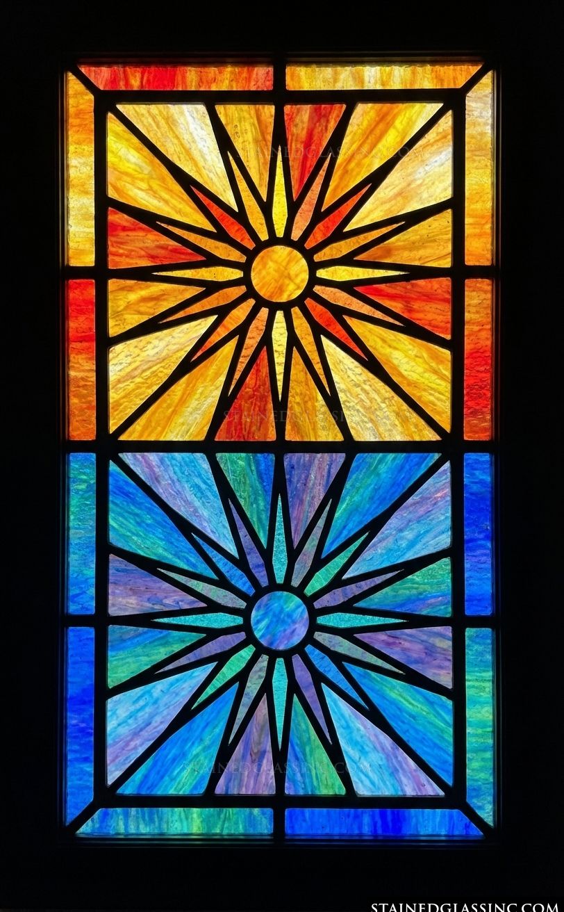 This striking stained-glass-style artwork creates a bold visual statement by pairing two distinct, energy-filled starburst patterns. The top section glows with the warmth of a brilliant sunrise, utilizing radiant yellows, ambers, and fiery reds to suggest light emanating from a central source. It is balanced beautifully by the lower section, which draws the eye into the cool, calming depths of the sea and sky with its vibrant shades of blue, turquoise, and violet.