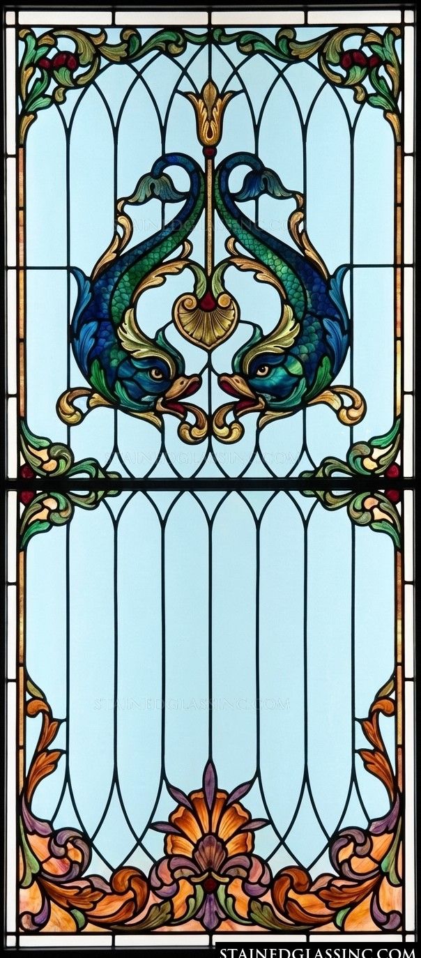 This stunning design captures the grace of classical motifs through a perfectly balanced composition. At the center, two stylized dolphins face one another, their bodies rendered in rich, deep blues and emerald greens that evoke the tranquil mystery of the sea. They are flanked by elegantly swirling patterns, creating a sense of movement and harmony that commands attention.