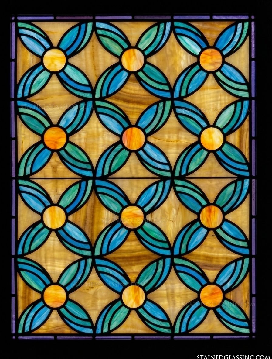Experience the timeless charm of this elegant lattice design. The artwork features a repeating sequence of stylized, four-petaled blooms, beautifully rendered in shades of cobalt blue and sea-foam green. Each floral element is anchored by a warm, radiant amber center, creating a stunning visual contrast that captures the light with grace.