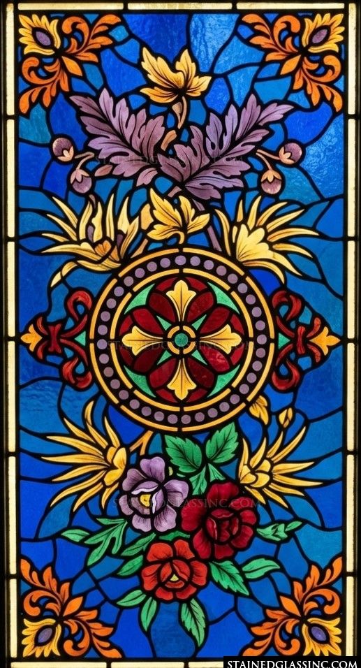 This captivating stained-glass-style design brings the elegance of a garden sanctuary into your home. A beautifully balanced central medallion serves as the focal point, radiating with deep jewel tones and precise, artistic symmetry. The surrounding area is filled with an abundance of blooming roses, delicate botanical leaves, and intricate scrolls that create a sense of timeless movement and grace.