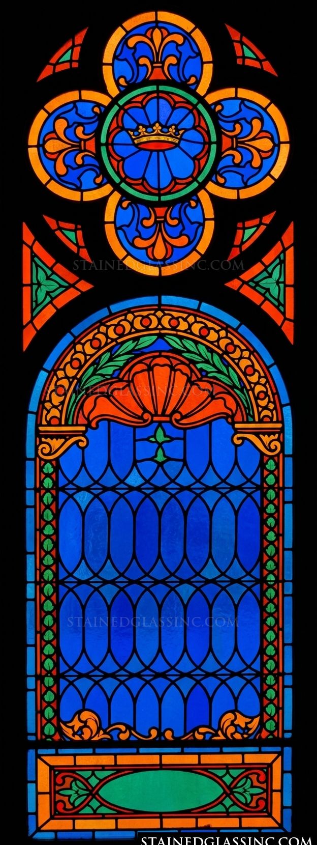 Experience the timeless elegance of this beautifully composed design, which draws inspiration from historic architectural artistry. At its pinnacle, a golden crown is centered within a classic quatrefoil, symbolizing royalty and triumph. The vibrant, saturated blues and warm, glowing orange accents create a striking interplay of light that brings a sense of sacred majesty to any space.