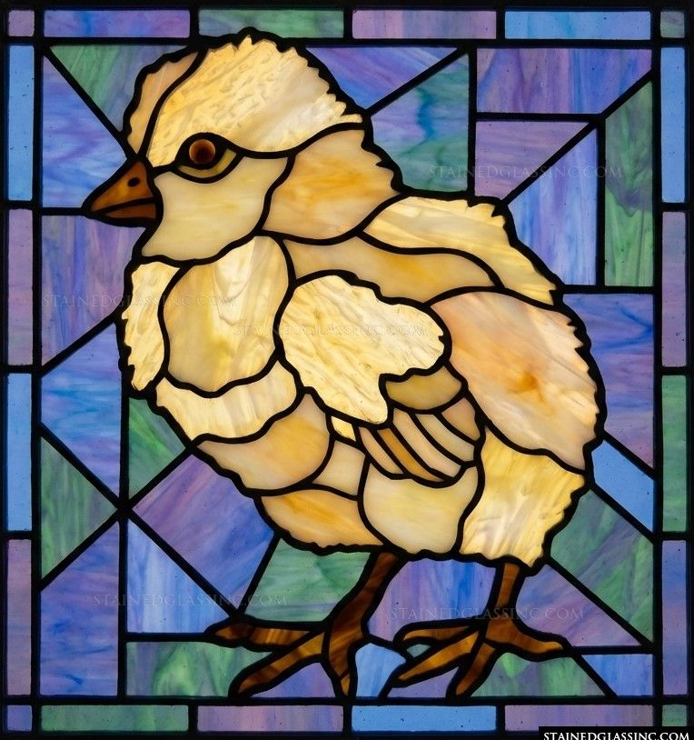 Celebrate the arrival of spring with this endearing portrait of a little chick. Rendered in a stunning stained-glass-style, the artwork captures the soft, fluffy texture of the bird with warm, golden tones that seem to glow when light touches the surface.