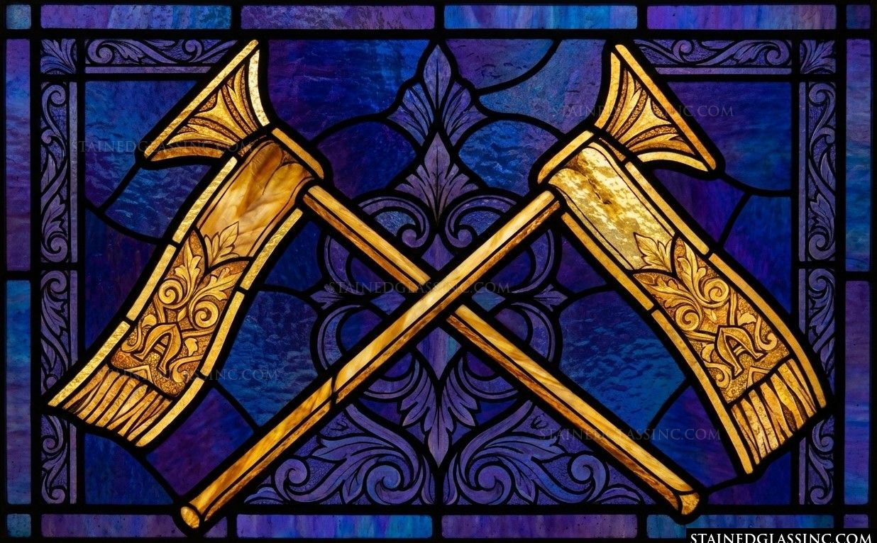 This captivating piece showcases a pair of majestic, golden ceremonial staffs displayed in a striking crossed composition. The rich, metallic gold of the staffs contrasts beautifully against a backdrop of deep, royal violet, creating a sense of regal authority and timeless elegance. Intricate acanthus leaf carvings adorn the shafts, highlighting the meticulous artistry within this design.