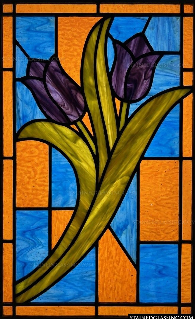 Celebrate the arrival of spring with this stunning stained-glass-style artwork. Two graceful tulips, rendered in a deep, swirling purple, reach upward with an elegance that captures the beauty of a garden in full bloom. Their rich color is perfectly complemented by the bold, sweeping green stems and leaves that anchor the composition.