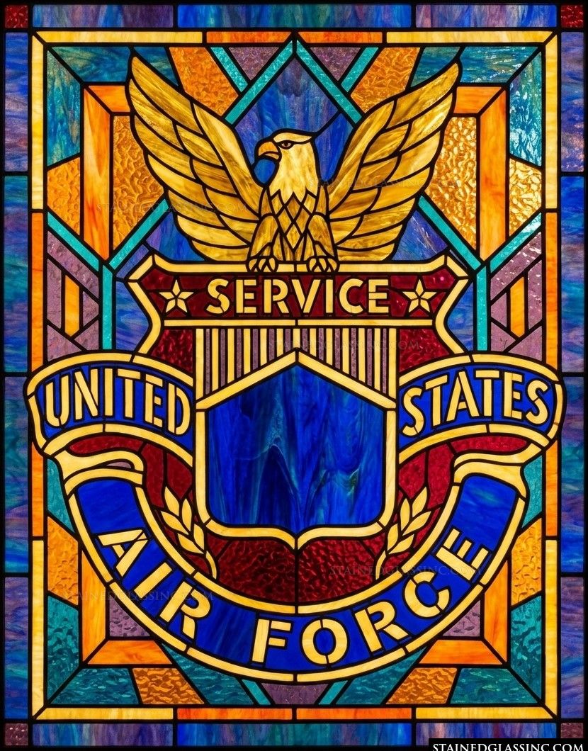 Glowing in shades of cobalt blue and golden yellow, this artistry brings a sense of nobility and purpose to any space. It serves as a beautiful tribute to those who serve, rendered in a luminous style that catches the light and celebrates the proud tradition of the Air Force with timeless, intricate detail.