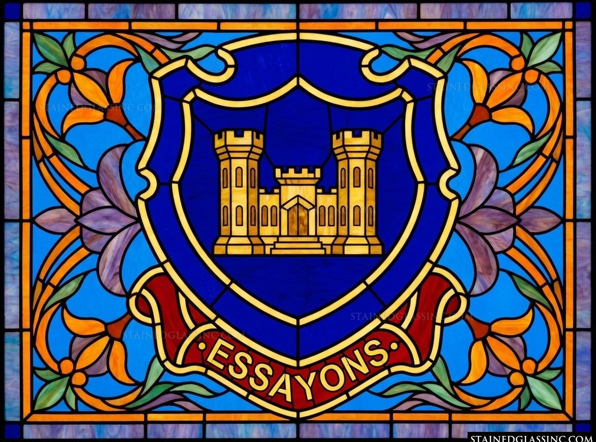 The design is framed by flowing, organic motifs and elegant floral accents in warm amber and cool purple, creating a striking contrast that draws the eye to the central banner. Proudly displaying the French motto Essayons—meaning "Let us try"—this piece serves as a sophisticated tribute to service, dedication, and the enduring pursuit of noble goals.