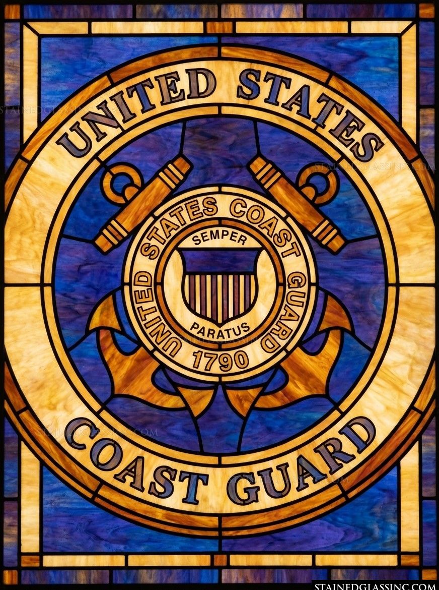 This dignified design captures the essence of the United States Coast Guard, featuring the iconic seal meticulously crafted in a vibrant, stained-glass-inspired composition. The bold lettering and traditional anchor imagery are brought to life through a striking contrast of deep, atmospheric blues and warm, glowing golden amber hues, creating a piece that exudes both strength and artistry.