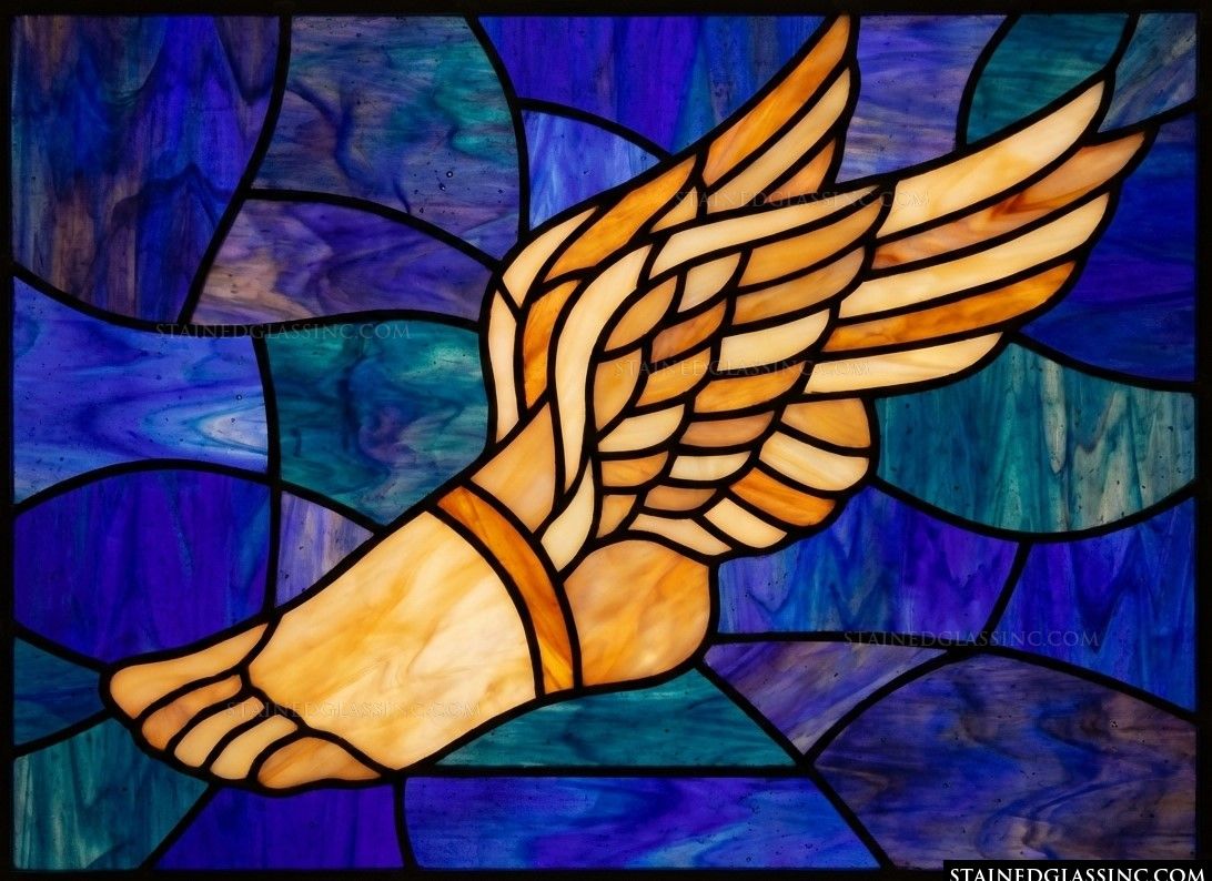 Embrace the spirit of speed and divine communication with this striking design. Inspired by classical mythology, the artwork showcases a beautifully rendered golden sandal adorned with graceful, flowing wings. The warm, amber tones of the foot and feathers provide a brilliant contrast against the deep, moody backdrop.