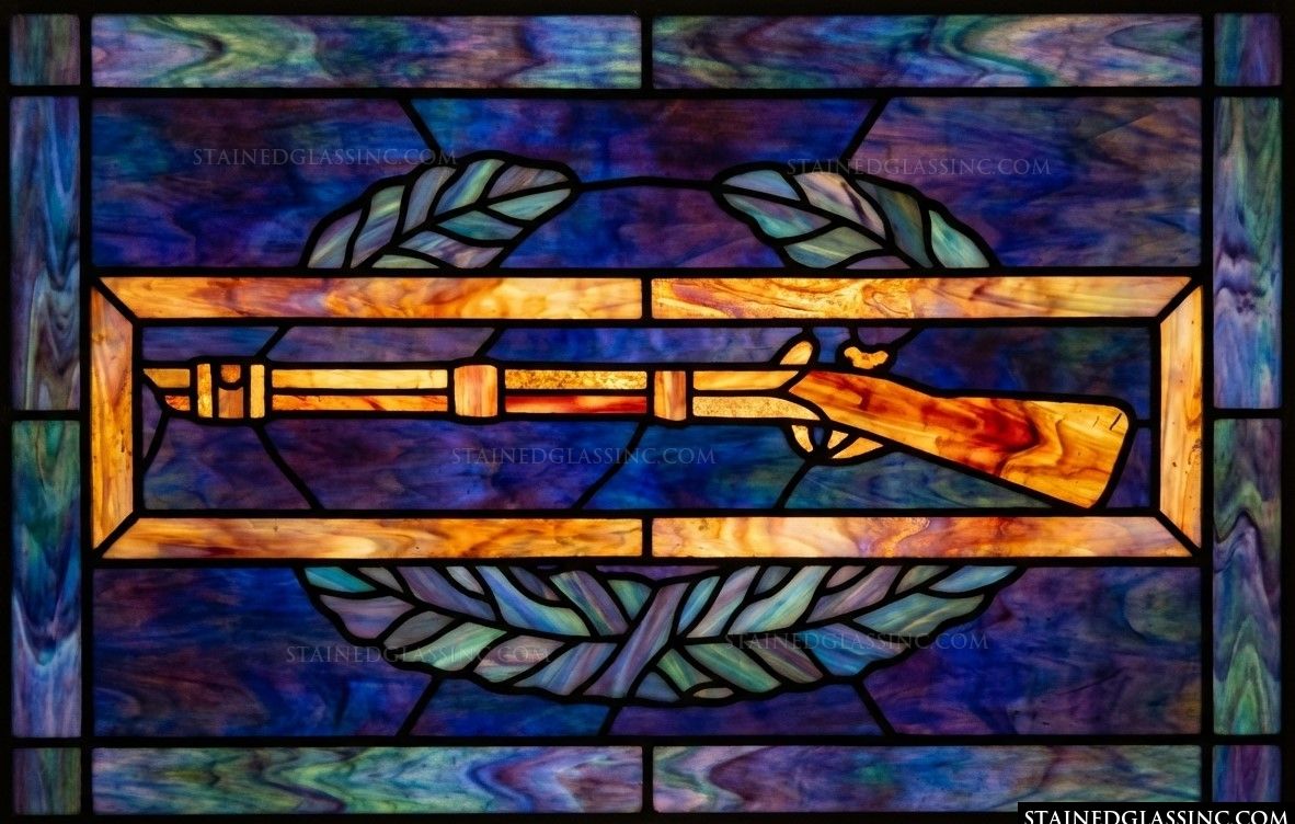 This dignified design pays tribute to a timeless military tradition, centered on the iconic infantry rifle. Expertly rendered in glowing shades of warm amber and gold, the weapon is framed within a classic rectangular border, symbolizing focus, precision, and historical significance. The surrounding laurel wreath, executed in variegated cool blue tones, adds a sense of honor and victory to the composition.