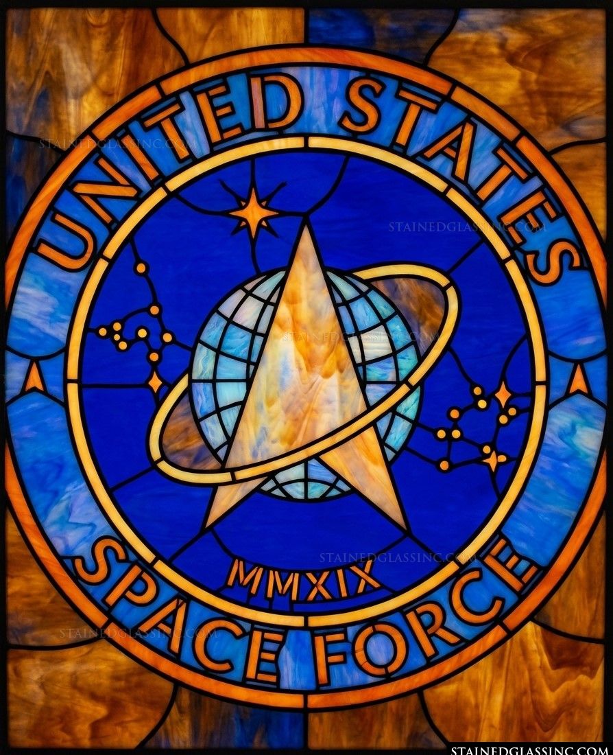 This captivating design honors the spirit of discovery and the vast reaches of the cosmos. Rendered in the timeless aesthetic of stained-glass artistry, the United States Space Force emblem is elevated through a brilliant interplay of light and color. The deep, resonant cobalt blue of the backdrop provides a striking contrast to the warm, luminous amber tones that define the central delta and planetary rings.