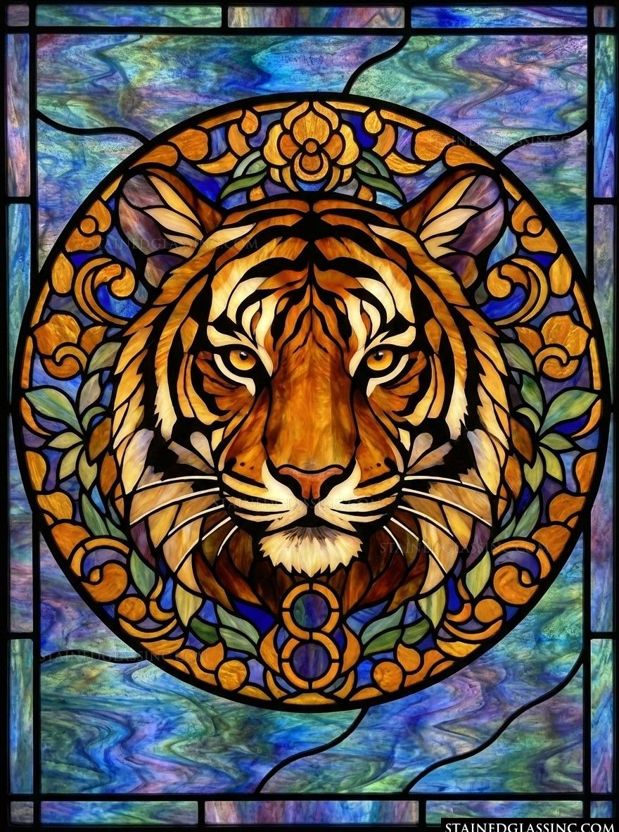 Embrace the fierce beauty of the jungle with this captivating tiger portrait. Centered within a circular medallion, the tiger’s piercing golden eyes and detailed facial markings are rendered with remarkable depth and warmth. The artwork radiates a sense of strength and focus, making it a powerful focal point for your home.