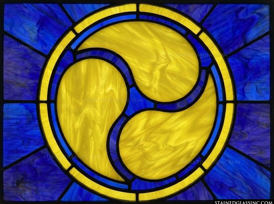 Experience the captivating movement of this stained-glass-style artistry, where three flowing, golden forms swirl in graceful harmony. The striking contrast between the luminous, warm amber tones and the deep, rich cobalt blue creates a bold visual statement that feels both energetic and balanced.