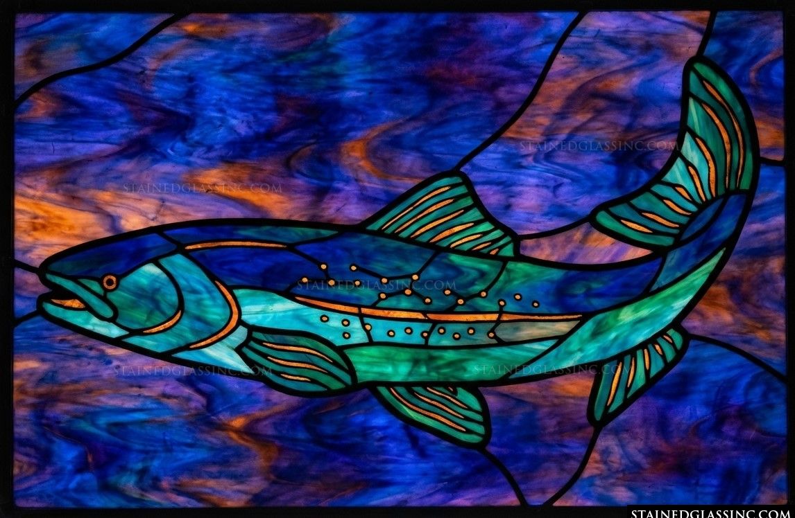 Celebrate the beauty of the natural world with this exquisite stained-glass-style design. The piece centers on a graceful trout, rendered in brilliant shades of turquoise and emerald, appearing to surge through deep, swirling waters. The clever use of color and light creates a sense of fluid motion, as if the fish is caught in a moment of spirited energy.