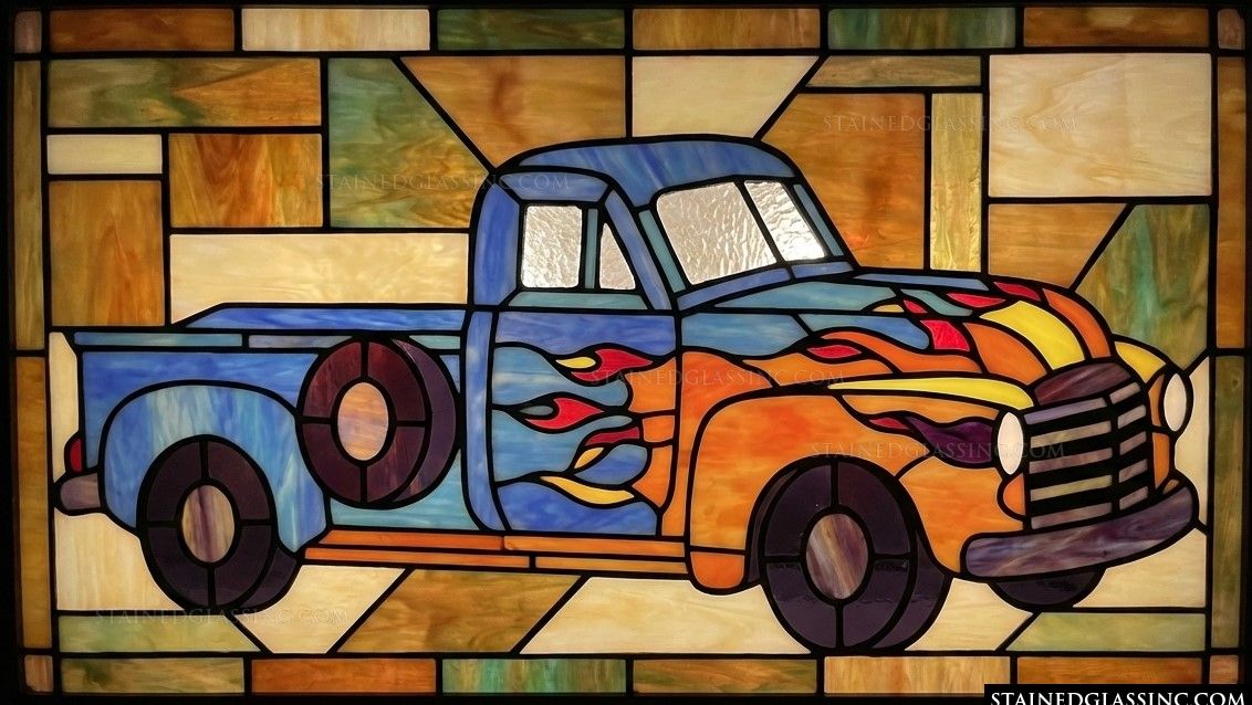 Capture the essence of American automotive nostalgia with this luminous, stained-glass-style design. The artwork beautifully highlights the iconic silhouette of a vintage pickup truck, reimagined through glowing, vibrant colors that bring the scene to life. The piece is energized by bold, artistic flames sweeping across the hood and side, adding a sense of movement and fiery spirit to the classic vehicle.