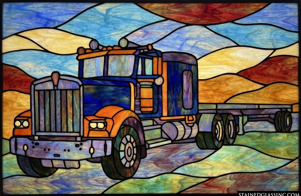 Set against a sweeping, dramatic backdrop of rolling skies in shades of gold, amber, and blue, the truck takes center stage as an icon of travel and industry. This piece perfectly balances bold, industrial strength with the delicate artistry of light and color, making it an ideal choice for anyone who appreciates the romance of the open road.