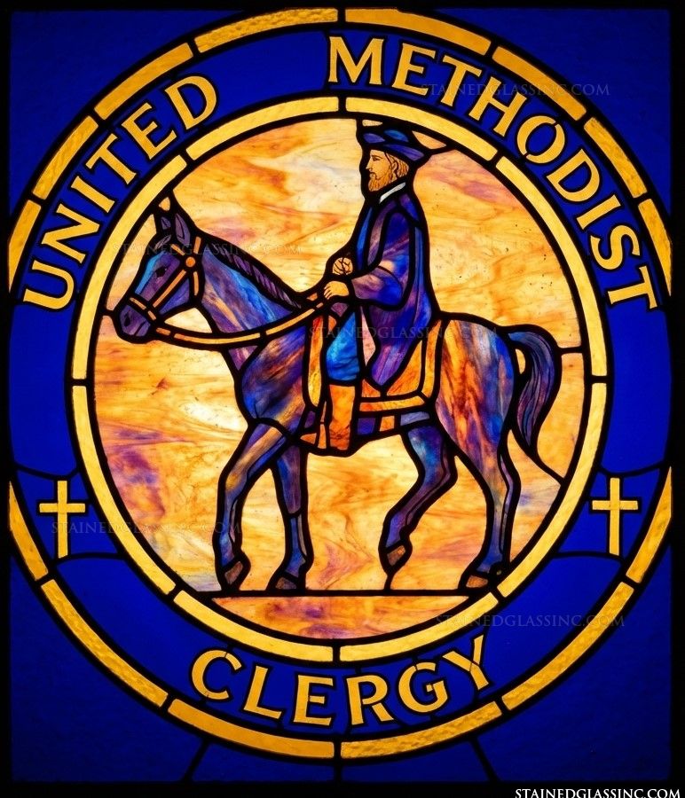 This evocative stained-glass-style design captures the humble, steadfast spirit of the early Methodist movement. At its center, a circuit rider—the iconic, saddle-bound minister who traveled tirelessly to bring faith to the frontier—is depicted in profile, captured mid-journey against a radiant, amber-hued backdrop. His figure, rendered in deep blues, speaks to the dedication and quiet resilience of those who traversed difficult landscapes to serve their communities.
