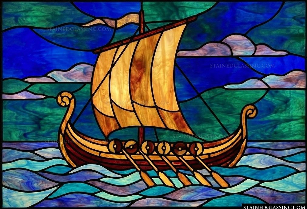 The composition is brought to life through a rich, jewel-toned palette. Deep, swirling blues and vibrant teals of the sea contrast beautifully with the warm, amber glow of the ship's sail and woodwork. This piece invites you to set sail on a voyage of the imagination, making it a striking focal point for any room that appreciates history, maritime lore, and the artistry of light.