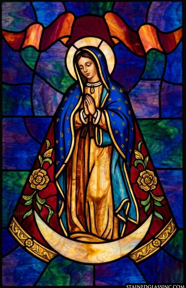This radiant artistic portrayal of Our Lady of Guadalupe captures her serene grace and divine presence through brilliant, glowing colors. With her hands clasped in prayer, she is surrounded by rich, jewel-toned hues that evoke a sense of quiet reverence and deep peace. Every detail, from the delicate floral motifs to the golden crescent moon at her feet, shines with an ethereal beauty.