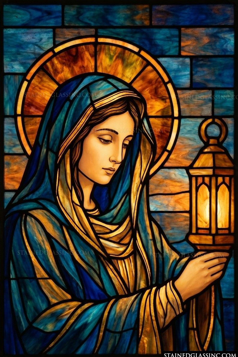 This beautiful stained-glass-style design features the Blessed Mother in a moment of quiet reflection. She is depicted with a gentle, serene expression, cradling a lantern that glows with a warm, steady light, symbolizing hope and divine guidance in the darkness.