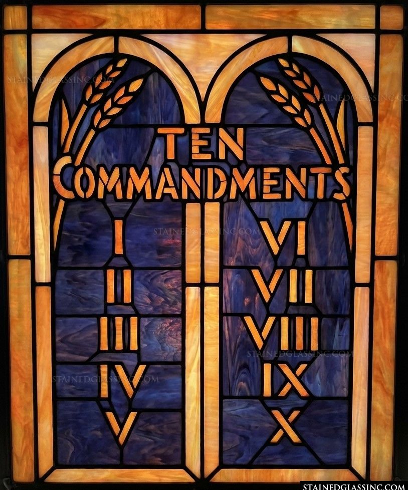 Celebrate the foundation of faith with this luminous design, depicting the Ten Commandments etched upon traditional dual stone tablets. The artwork is beautifully balanced, utilizing deep, meditative blues that suggest the sanctity of the original Law, contrasted against the warm, radiant gold of the stone borders and wheat stalks that arch gracefully overhead.