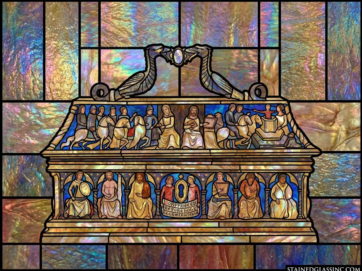 This intricate stained-glass-style design captures the solemn beauty of an ancient reliquary, rendered with remarkable precision. The artistry features a two-tiered composition: the upper register displays a procession of horsemen flanking central figures, while the lower level presents a series of seated individuals beneath classic arches, centered around an inscribed plaque.