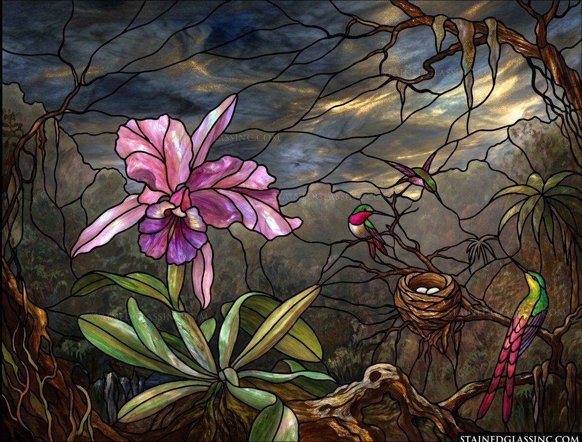 Surrounding the orchid, a trio of graceful hummingbirds adds a touch of lively movement to the composition. One bird rests near its woven nest, protecting its tiny eggs, while others hover nearby in the dappled light. Set against a backdrop of darkening skies and tangled, ancient branches, this scene perfectly balances the delicate fragility of nature with the raw, atmospheric mood of the wild.