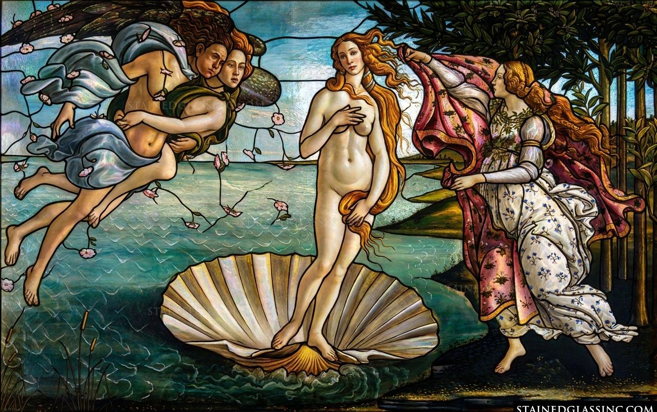 Bring the iconic splendor of the Renaissance into your home with this stunning stained-glass-style rendition of the Birth of Venus. This luminous design captures the goddess in her moment of emergence, standing gracefully upon a shell as she is welcomed to the shore. The flowing lines and delicate composition mirror the original artistry, inviting a sense of timeless elegance and mythological wonder into any space.