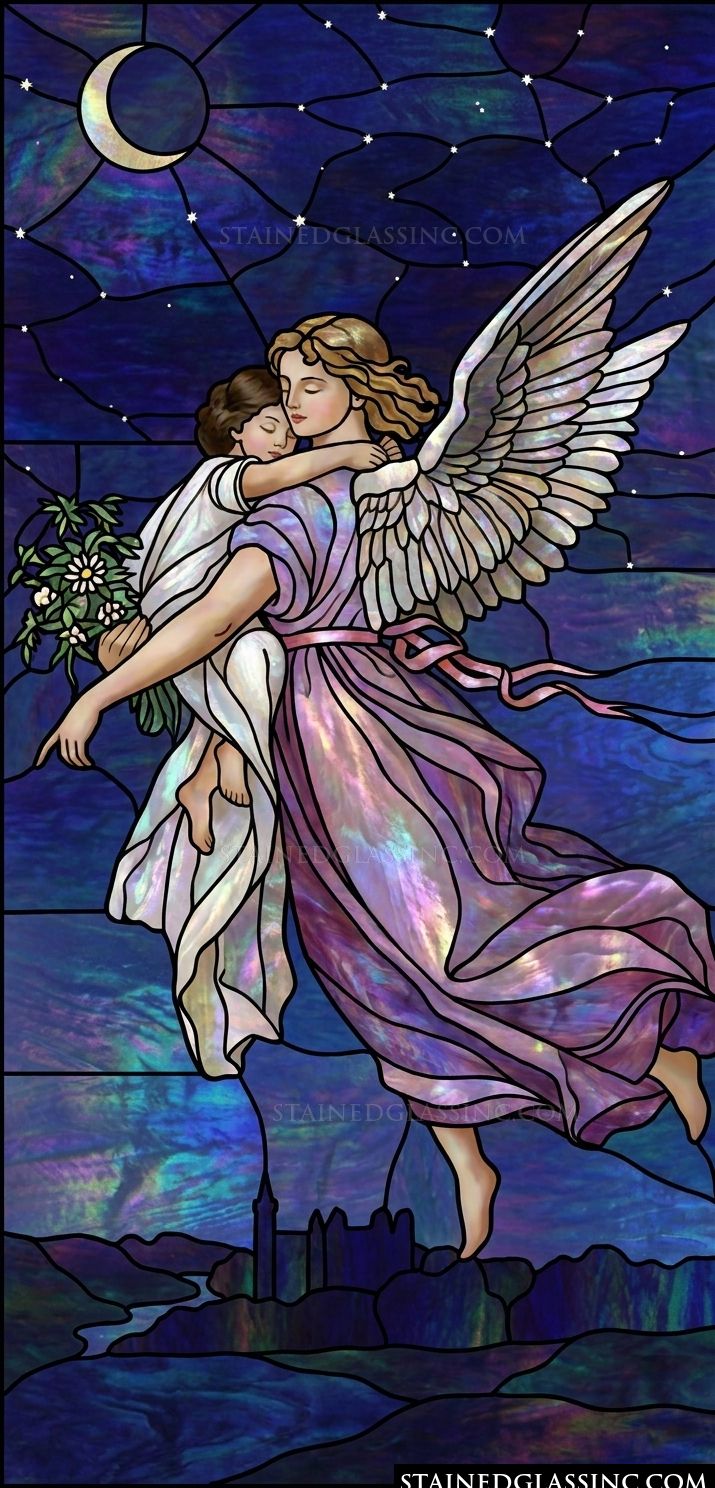 This breathtaking stained-glass-style design captures a moment of pure, celestial serenity. A graceful guardian angel, depicted with soft, iridescent robes and vast, sweeping wings, tenderly cradles a sleeping child in her arms. The child clutches a delicate bouquet of white blossoms, resting peacefully against the angel's shoulder as they glide through the velvet expanse of a starlit night.