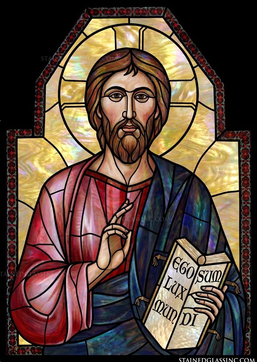 This luminous stained-glass-style design captures a serene and powerful portrait of Christ. With a hand raised in a gesture of blessing and his gaze directed forward, the figure embodies peace and authority. The rich, deep tones of his crimson and blue robes provide a striking contrast against the glowing, golden nimbus that surrounds his head, casting a warm light throughout the entire composition.