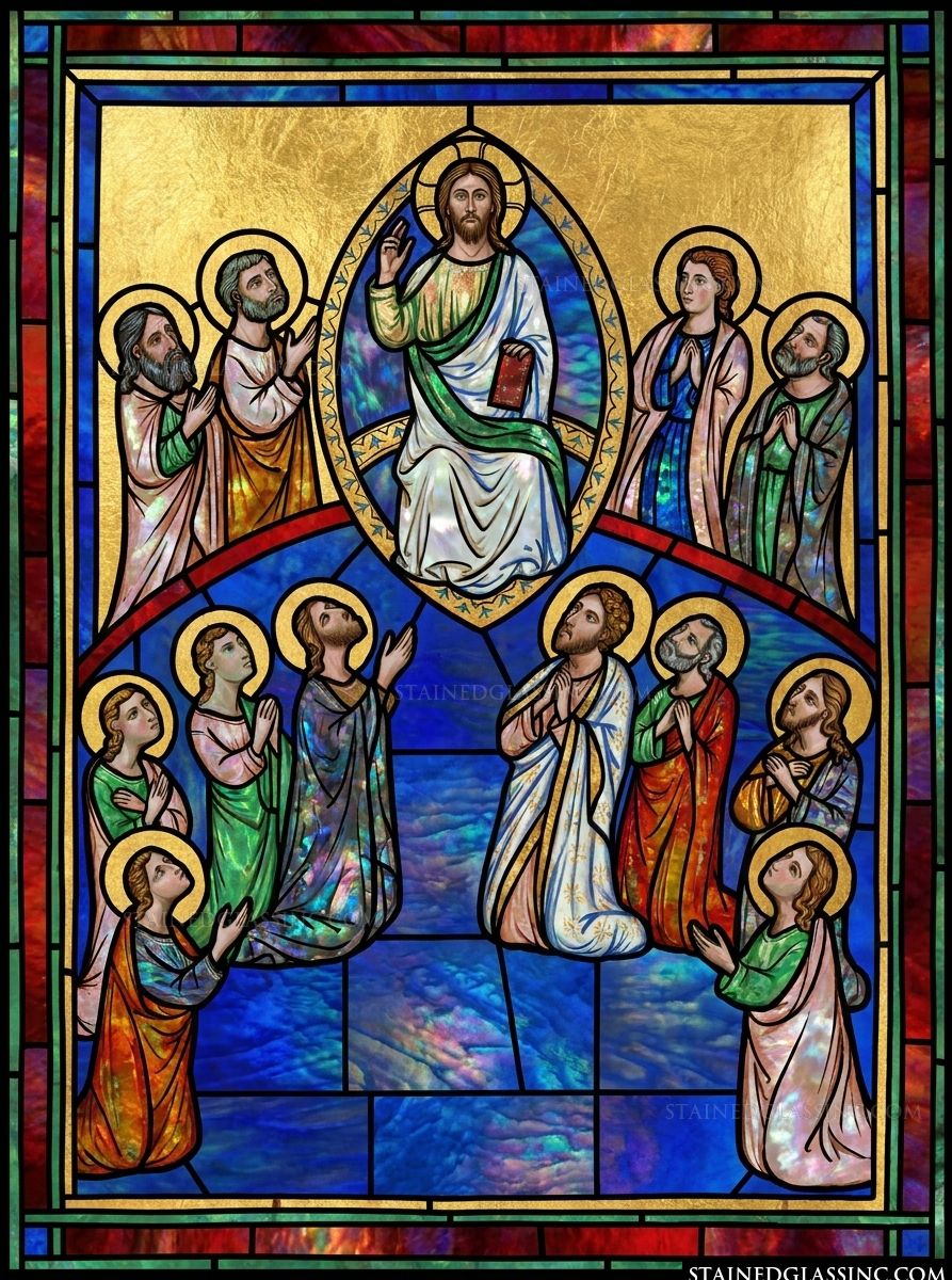 This breathtaking stained-glass-style design captures the sacred moment of the Ascension, featuring a majestic depiction of Christ ascending toward the heavens. Surrounded by a glowing mandorla, he is shown with one hand raised in a divine gesture of blessing, while his followers look upward in profound awe and reverence.