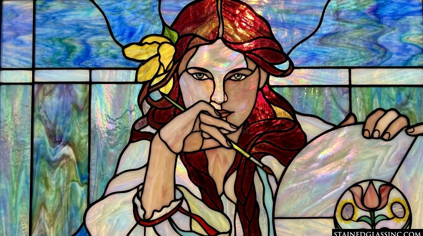 Celebrate the spirit of inspiration with this stunning stained-glass-style artistry. The composition centers on a young woman with radiant red hair, her expression focused as she contemplates her next creative stroke. With a delicate brush held to her chin and a painter's palette in hand, she embodies the timeless beauty of the artistic process.
