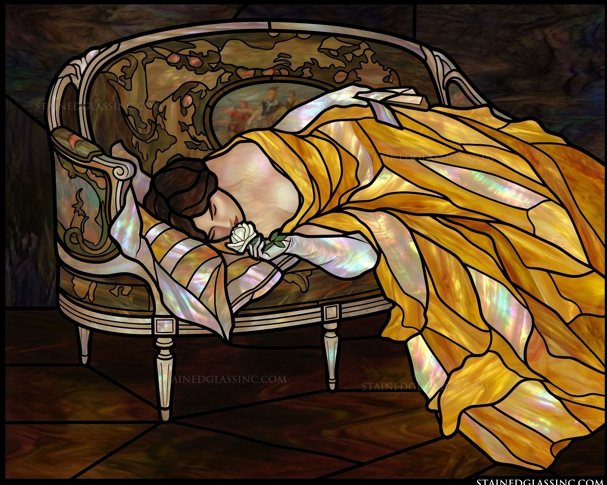 This luminous design portrays a scene of timeless elegance and quiet reflection. A woman, draped in a magnificent, flowing gown of deep golden hues, rests peacefully upon an elaborately carved settee. The composition masterfully captures the gentle curve of her posture as she reclines, lost in a tranquil dream.