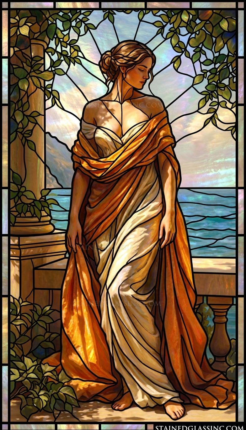 Framed by an architectural balustrade and delicate, trailing ivy, the scene opens to a tranquil coastal vista. The rich, warm tones of her attire are complemented by the cooling blues of the sea and sky, creating a harmonious interplay of color. This piece offers a sophisticated, romantic aesthetic that brings timeless artistry and a soothing, natural mood to any room.