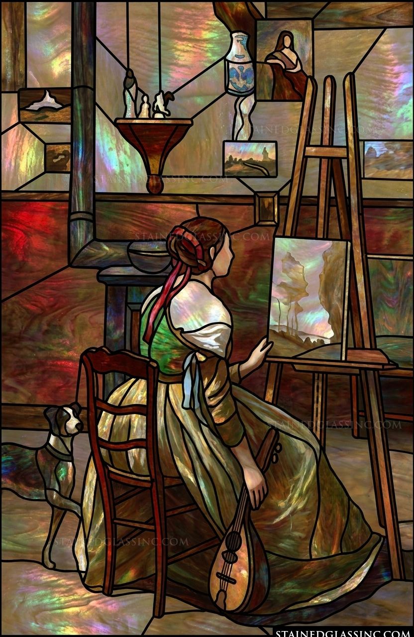 This captivating stained-glass-style design invites you into the peaceful sanctuary of an artist's studio. A woman sits in quiet contemplation before her easel, brush in hand, as she brings a luminous landscape to life upon her canvas. A mandolin rests gracefully in her lap, suggesting a life filled with melody and inspiration.