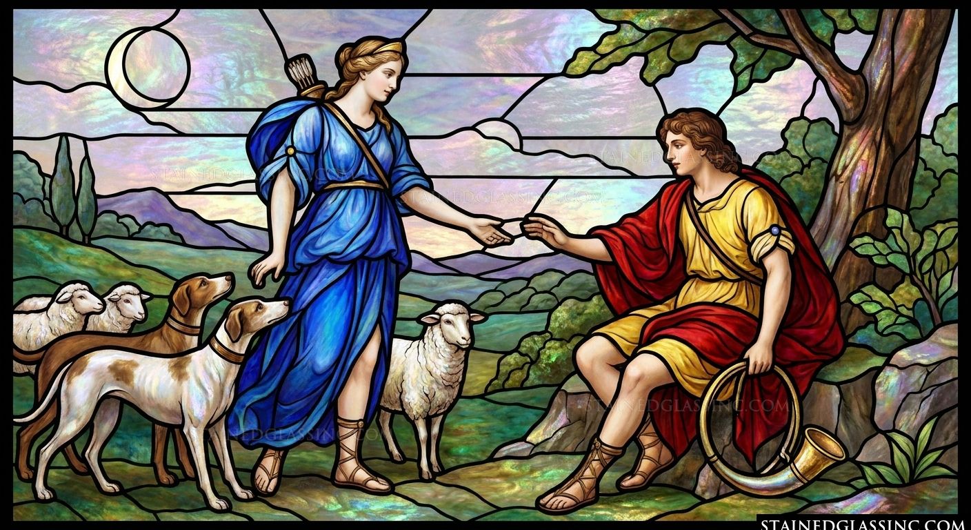 This captivating stained-glass-style design brings a classic mythological encounter to life with rich, vibrant colors. The scene captures the timeless meeting between Artemis, adorned in her flowing azure robes with her hunting bow at her side, and the shepherd Endymion, resting beneath the shade of an ancient tree. Accompanied by her faithful hounds, Artemis reaches out to the young shepherd, creating a moment of ethereal grace and wonder.