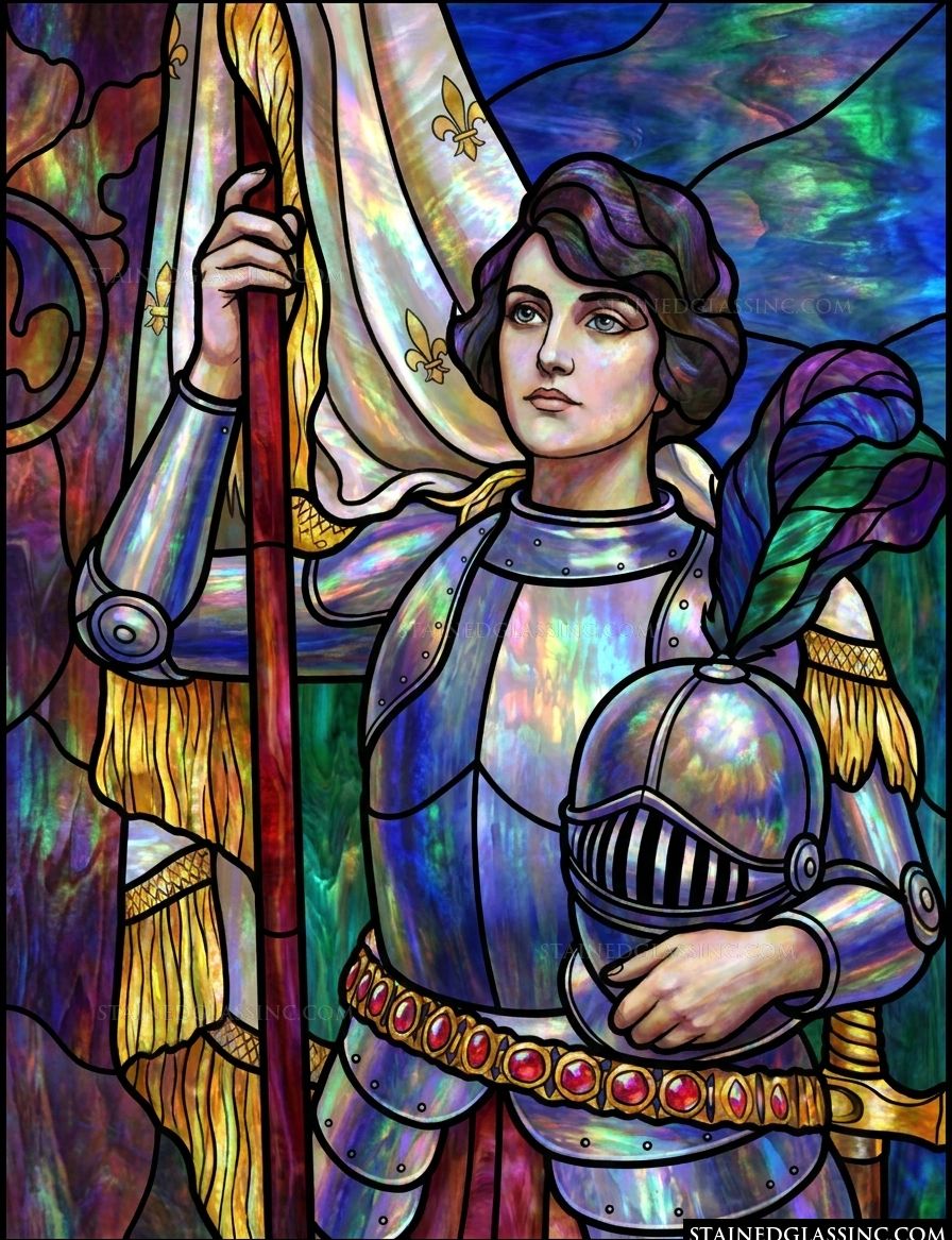 Embodying strength, conviction, and celestial grace, this stained-glass-style artistry captures the iconic figure of Joan of Arc. Clad in intricate plate armor that catches the light with a shimmering, iridescent quality, she stands as a beacon of unwavering faith and historical fortitude. Her gaze is lifted, reflecting the divine inspiration that guided her journey, while she firmly holds her standard, adorned with the golden fleur-de-lis.