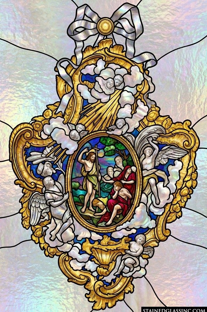 This breathtaking stained-glass-style design captures the solemn beauty of the Baptism of Christ. Set within an intricate, gilded oval cartouche, the scene depicts the serene figure of Jesus at the water's edge. The entire composition is elevated by a majestic arrangement of golden scrollwork and delicate, iridescent clouds, creating a sense of heavenly movement and grace.