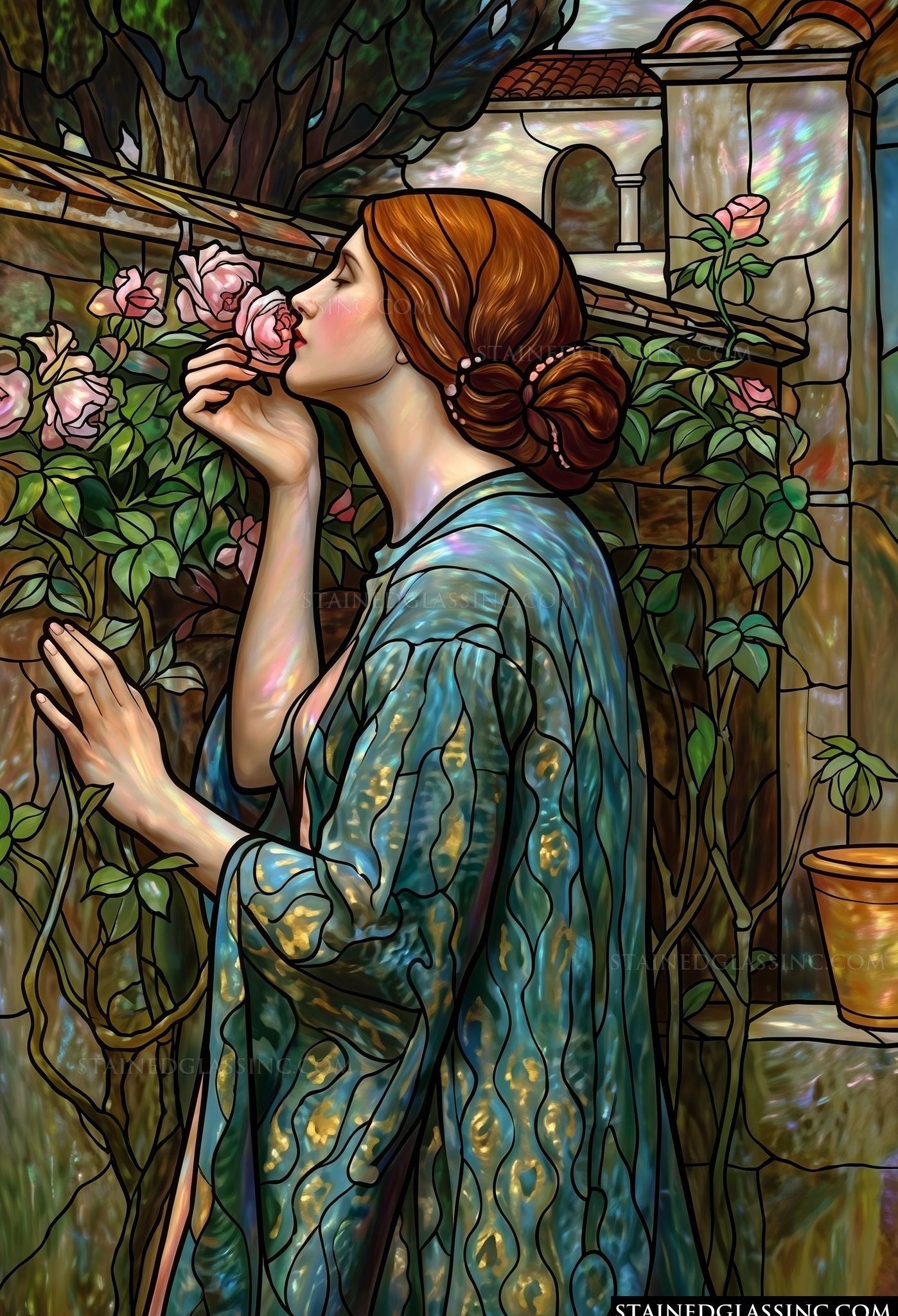 This luminous stained-glass-style design captures a moment of pure tranquility. A woman, rendered with elegant, flowing lines and soft, natural features, leans in to gently inhale the perfume of soft pink roses. Her attire, a shimmering robe of teal with golden accents, harmonizes beautifully with the lush, vining greenery of the garden setting.
