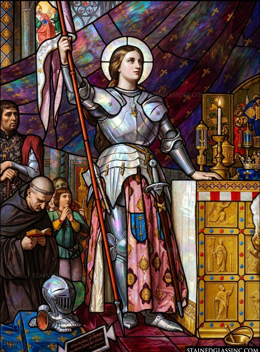 This captivating stained-glass-style design brings the legendary Joan of Arc to life, radiating with vibrant color and historical detail. The heroine stands tall in her polished armor, holding her banner high, while her gaze reflects a quiet, focused determination. The artist has expertly captured the play of light across her metallic plates and the intricate patterns of her regal vestments, creating a scene that feels both timeless and deeply personal.